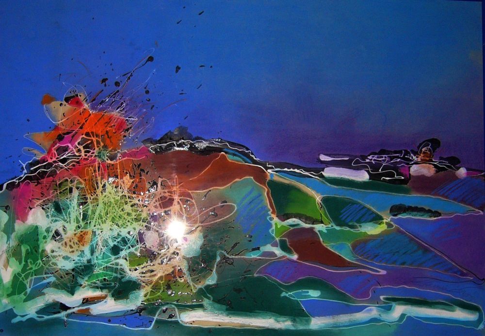 青みがかった風景アクリル, パステル, スプレー, 厚紙, 銀色の金属枠「Nielsen」2006年制作サイズ : 100×70cm価格 :20 000,- Kč / 88,900円